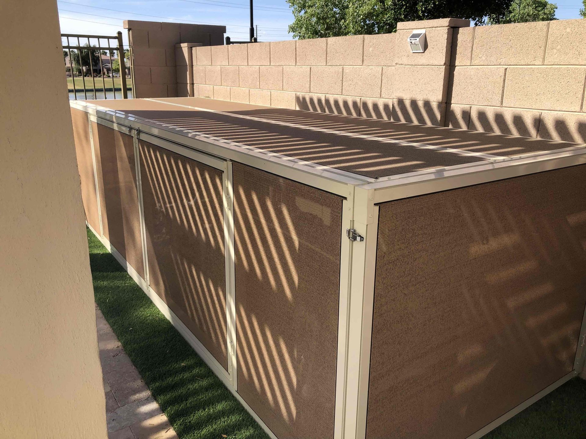 Have a shade structure made for your pet run, an electrical panel, propane tanks, and trash can areas. (Must have a supporting wall to attach to.)